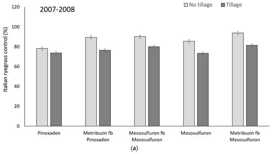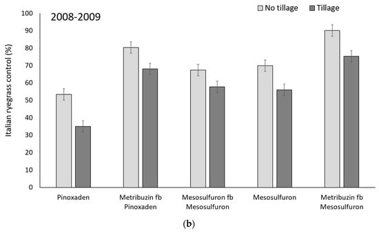 (a) Effects of herbicide program × tillage on percentage Italian ryegrass control in 2007–2008. Vertical bars represent Least Significant Difference (LSD) at 5% significance level (LSD for tillage and no tillage treatments = 3); (b) Effects of herbicide program × tillage on percentage Italian ryegrass control in 2008–2009. Vertical bars represent LSD at 5% significance level (LSD for tillage and no tillage treatments = 9).