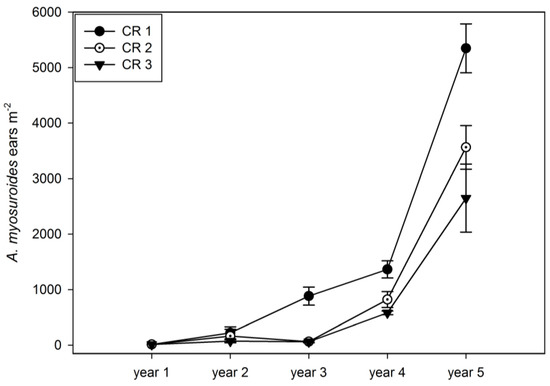A. myosuroides ears m−2 in the untreated control plots of crop rotations (CR) 1, 2 and 3 over the five-year experiment at Ihinger Hof, Renningen, Germany.