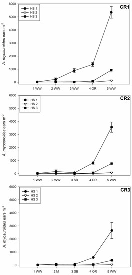 Crop rotation (CR), herbicide strategy (HS) and year, as well as their interaction, significantly influenced A. myosuroides density. A. myosuroides density was relatively low at the beginning of the experiment with an average density of 14 ears m−2. Plants were distributed homogenously within the experiment at the beginning. Infestation rates were below or close to the economic weed thresholds of 10–15 plants m−2 [19]. During the study, densities significantly increased in all three rotations in the untreated control plots (HS1) (Figure 1 and Figure 2, and Table 3). In the third year of winter wheat in CR1, A. myosuroides density increased to 883 ears m−2. After five years, a maximum density of 5347 ears m−2 was counted in CR1 (Figure 1). When winter wheat was replaced by spring barley in the third year (CR2), densities of A. myosuroides were 33% lower than in CR1. In CR3, with maize and spring barley, A. myosuroides densities were 50% lower than in CR1, after five years (Figure 1, Table 3).