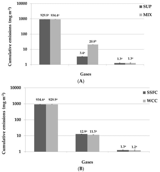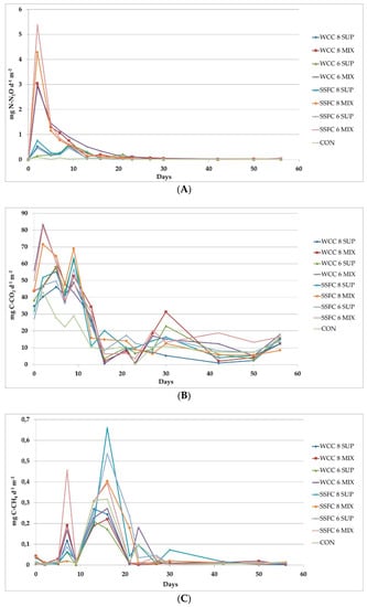 As shown in Figure 1A, during the 57-day incubation period, N2O emission from all fertilized soils peaked 48 h after pellet application, but then decreased to Control level until the end of the experiment. Peak rates ranged from 0.15 mg N-N2O day−1 m−2 (i.e., soil fertilized with WCC 6 SUP) to 5.39 mg·N-N2O day−1 m−2 (i.e., soil fertilized with SSFC 6 MIX). Such values are lower than those obtained in a laboratory scale experiment by Fangueiro et al. [] under favourable conditions to N2O formation. Factors such as manure type, N application rate, temperature, soil type, moisture content and water holding capacity of the soil have been suggested by Sahrawat and Keeney [] to affect N2O production after manure application. As stated by Bertora et al. [], the peak of N2O emission occurred during the initial period of fast nitrification and these fluxes can be attributed both to nitrification of the added NH4+ and denitrification of the produced NO3−. In this context, the soil moisture content adopted in this experiment could promote both nitrification and denitrification []. From day 20 to the end of the study, the N2O emission was similar for all treatments (p > 0.05).