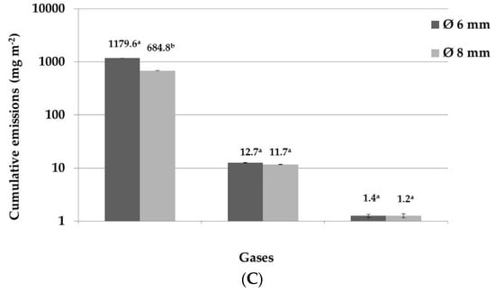 At the end of the experiment, cumulative emissions ranged from 601.89 mg C-CO2 m−2 for WCC 8 MIX to 1170.34 mg C-CO2 m−2 for SSFC 6 SUP (Table 3 and Table 4). As shown in Figure 2, when pellet diameter is smaller, carbon dioxide emission increased significantly (p < 0.05), while compost type and application method did not affect significantly CO2 emission (p > 0.05).