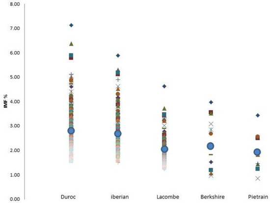 The average intramuscular fat percentage (IMF %) in the longissimus dorsi muscle of the five cross breeds. The IMF % was calculated on the lean muscle using an NMR analyser. The overall average IMF mean percentage (µ ± std dev) is represented by the blue dot within each breed sire subgroup: Duroc 2.9 ± 0.7%, Iberian 2.8 ± 0.6%, Lacombe 2.0 ± 0.4%, Berkshire 2.4 ± 0.8%, and Pietrain 2.0 ± 0.6%.