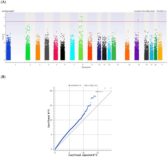 (A) Manhattan and (B) QQ plot of the GWAS analysis of IMF % in Duroc-sired pigs (n = 40). The red line indicates the threshold for genome-wide significance (P < 4.5 × 10−8) for 68,529 SNPs adjusted for sex and MAF < 0.01. The QQ plot shows a distribution of expected IMF % values that are skewed when their SNPs are correlated on the extreme end of the data for the Duroc samples.