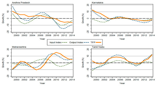 TFP growth in the state of Tamil Nadu was always positive, despite a very low level in the period from 1999 to 2002. However, for the states of Karnataka and Andhra Pradesh there appears to be a negative trend, the average TFP growth for the entire period from 1999 to 2014 was slightly positive. The level of TFP growth of these states was very high from 1999 to 2002 (>7%) before decreasing constantly. The TFP growth in the sub-period from 2007 to 2010 accounted for less than 1% but was positive, whereas it declined quite considerably between 2010 and 2014 (−5% to −3%). The results obtained for the state of Karnataka show negative growth and are similar to those calculated by Kumar and Mittal [27], who assessed the period from 1986 to 2000. For the state of Tamil Nadu, however, different results emerged. In that state, our calculation indicates a TFP growth of almost 4% from 1999 to 2014, while Kumar and Mittal [27] found TFP growth to be negative in the previous period from 1986 to 2000. As for the state of Maharashtra, there is no clear tendency even though we observe that TFP growth has been clearly positive since 2007 (around 8%), reversing a negative earlier trend.