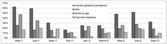Furthermore, general analysis showed an effect of the farm (p < 0.0001) and of the time of sample collection (p < 0.01) as well as an effect of the interaction between both (p < 0.05). For all parasites, lowest overall parasitic prevalence was found in winter (Figure 1); however, this factor varied among herds (Table 3).