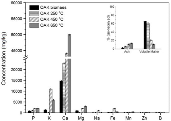 Distribution of the main micro- and macro-mineral contents within oak biomass, hydrochar, and biochars (mg/kg, dry basis). Inset: Ash and volatile content of oak biomass and chars (%wt., as received basis). Based on duplicate data with repeatability typically within ±2%. Error bars represent deviation around the mean.