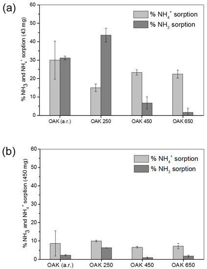 The NH3 and NH4+ sorption profiles of untreated oak biochars and hydrochars are presented in Figure 2 for concentrations equating to (a) 43 mg and (b) 450 mg NH3/NH4+. The different conditions are used to assess the influence of the concentration of N species on sorption capacity and to simulate low to high levels of N species. The increase in total N content after exposure to 43 mg NH3 is 11.0 ± 0.4 mg g−1 for oak biomass and between 0.58–15.4 mg g−1 for the resulting chars. These levels are comparable to those reported in the literature; an average increment of 6.7 ± 0.6 mg g−1 as reported by Taghizadeh-Toosi et al. [11].