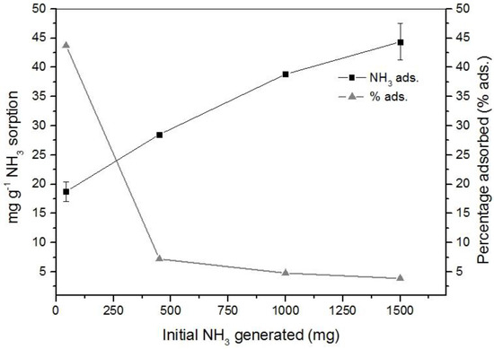 NH3 sorption capacities for Oak 250 hydrochar at 43, 450, 1000, and 1500 mg NH3 gas generated according to Equation (2). Error bars represent deviation around the mean. For statistical analysis please refer to Supplementary Material Table S3.