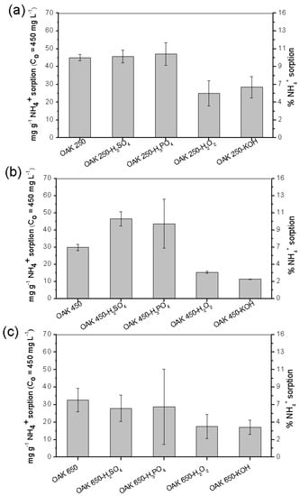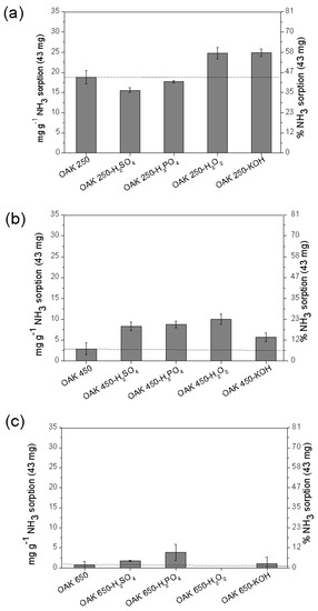 NH3 sorption by (a) treated oak 250 °C hydrochar; (b) treated oak 450 °C biochar; and (c) treated oak 650 °C biochar d3 mg NH3 gas generated according to Equation (2). Error bars represent deviation around the mean. For statistical analysis please refer to Supplementary Material Tables S4–S6.