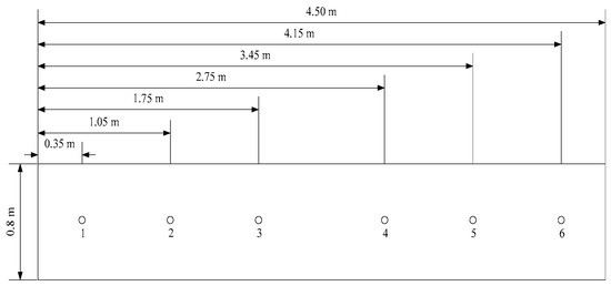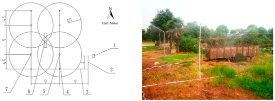 As shown in Figure 1, the box frame sprinkler irrigation system was composed of a box frame, pump station, main pipe, distribution pipe, lateral pipe, standpipe, and sprinkler. The distance between two sprinklers was 9.0 m. In order to reduce the pressure difference between sprinklers and improve the uniformity of spraying water, lateral pipes with a length of 4.5 m were laid along the slope. Four sprinklers were set up around the box frame with an effective radius of 7.0 m. The box frame was 4.5 m in length, 0.8 m in width, and 0.8 m in depth, and the adjustable range of the gradient is 0–15°. To ensure the box frame was well drained, drain holes (diameter 1.0 cm) were set up at the bottom of the box. The exterior of the box was made of an acrylic plate (80.0 cm × 0.5 cm, transparency 99.0%) to facilitate the measurement of infiltration depth. The sampled tea cultivar was Anji white tea, which was five years old. Six tea plants were planted in the frame box with distances of 0.35, 1.05, 1.75, 2.75, 3.45, and 4.15 m (Figure 2). Three kinds of plastic impact-driven sprinklers were selected. Technical parameters of the sprinklers are listed in Table 1. Three kinds of water application rates were set up using the different types of sprinklers with flow rates of 0.4, 0.6, and 0.8 m3·h−1. A plastic shade was set up above the experiment area on rainy days to avoid the influence of rainfall.