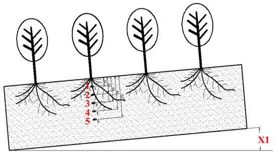 Sensor layout. TRIME PICO 64 soil moisture sensors were arranged along the roots of tea plants. Numbers 1–5 represent the sensors located at depths of 10.0 cm, 20.0 cm, 30.0 cm, 40.0 cm, and 50.0 cm, respectively. X1 represents the slope gradient, which could be adjusted from 0–15°.