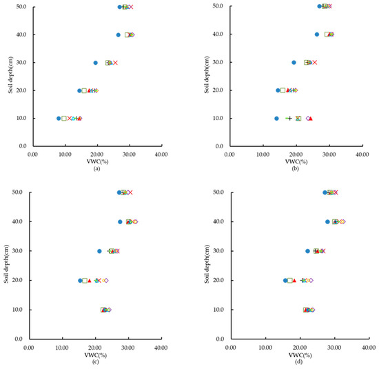 Volumetric water content (VWC) before irrigation, at the time of stopping irrigation, and 12 h and 24 h after sprinkler irrigation with different treatments, T1(□), T2(▲), T3(+), T4(●), T5(×), T6(△), T7(◇), T8(○), and T9(▬): (a) before irrigation; (b) at the time of stopping irrigation; (c) 12 h after irrigation; (d) 24 h after irrigation.