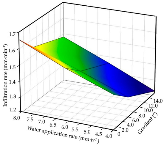 Using multivariate regression analysis, the linear regression equations for infiltration rate, slope gradient, and water application rate were obtained. The R2 was 0.92 and the RMSE was 0.02 mm·h−1. The linear regression equations were as follows: