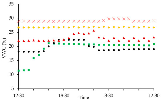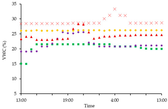 VWC at the slope gradient of 8° and the water application rate of 4.0 mm∙h−1, with soil depths of 10 cm (■), 20 cm (●) 30 cm (▲), 40 cm (×), and 50 cm (◆).