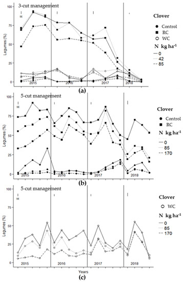 Effect of nitrogen (N) fertilizer application rates on legume percentage in red clover (RC) or white clover (WC) reseeded plots compared to the control plots (Control) under a (a) three-cut management or (b) and (c) under a five-cut management.