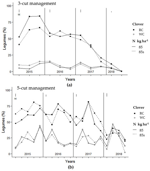 Effect of slurry- or mineral-N fertilizer applications on the percentage of legumes under a (a) three-cut or (b) five-cut management. (85 denotes 85 kg N ha−1 as mineral fertilizer, 85s denotes 85 kg N ha−1 as slurry-N).