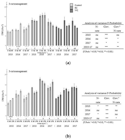 Effect of legume-reseeding and mineral-N-fertilizer-rate (kg N ha−1) on dry matter yield (DM) in the three years after reseeding under (a) a three-cut management or (b) a five-cut management (standard error is shown in the graph).