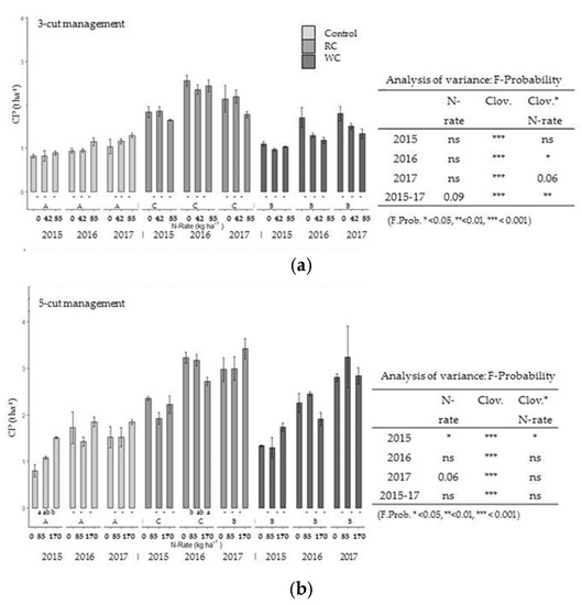Legume proportion was significantly influenced by N-application rates (Figure 1). Increasing fertilizer applications decreased the percentage of legumes in all harvests and for both legume species. Proportions of RC declined from generally around 75% (0N) to generally around 40–50% with N-application rates of 170 kg ha−1. Similarly, the percentage of WC declined from around 40% (0N) to around 6–12% with the highest N-rate. The decrease in legume percentage was positively correlated with N-fertilizer rate and was significant in all years, both legume species and both management options. The only exception was WC under the three-cut management, where legume percentage was already low due the unsuitable management option for WC and was not further reduced by N-applications. The other exception was RC at low N-rates of 42 kg N ha−1 (three-cut management), in which no legume decline compared to the RC-0N treatment was observed.