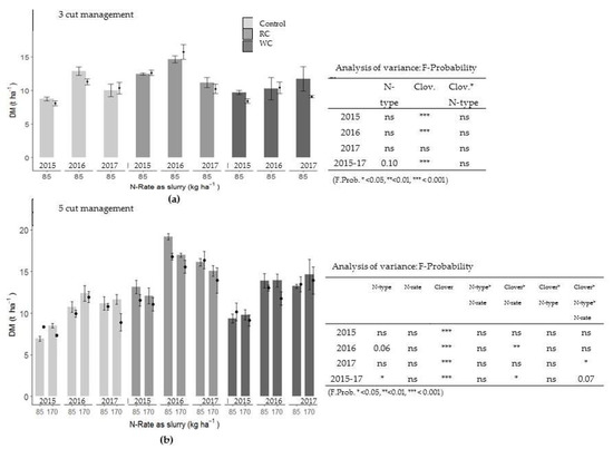 Effect of fertilizer–type, slurry-N (bars) compared to mineral-N applications (points) on dry matter yield (DM) of control, red clover (RC) or white clover (WC) reseeded plots for the three years after reseeding under (a) a three-cut management or (b) a five-cut management (standard error shown).
