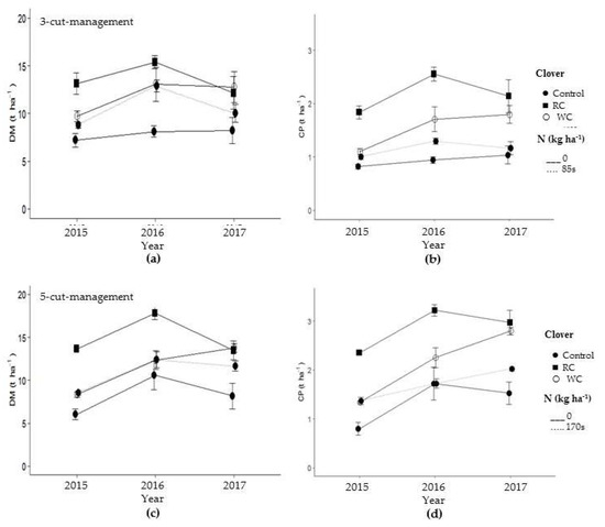 There were some yield variations between the three years (Figure 3 and Figure 4), with DM- and CP-yields being generally lower in 2015 and higher in 2016 and 2017. These variations were somewhat more pronounced under a five-cut than under a three-cut management. The only exception was the DM yield for RC in 2017, which tended to be lower compared to the DM yield in 2016.