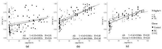 Legume percentage and their correlation to crude protein yield (CP) in control, red clover (RC) and white clover (WC) reseeded plots, with data from the five-cut management, harvest 1, 2, and 3 in (a) 2015, (b) 2016 and (c) 2017. Data from slurry and mineral-N treated plots are included. (Correlation models: Linear model using all data (“All”), (Control, RC, WC); Linear model using data from clover-reseeded plots only (“Clover”). (RC, WC).