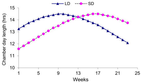 Figure 1. Daylength setting of the growth chambers for Long-day (LD) and Short-day (SD) plants. The LD and SD settings mimic farmers late (20 April) and early (1 March) planting seasons, respectively.