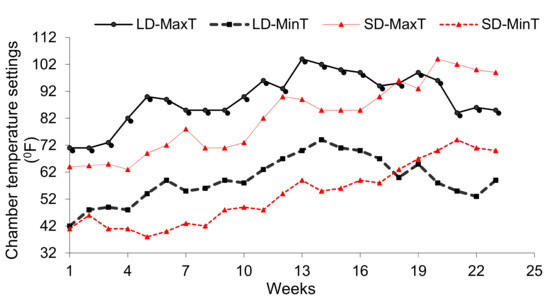 Figure 2. Weekly average maximum and minimum temperature setting of the chambers. LD-MaxT (Long-day Maximum temperature), LD-MinT (Long-day minimum temperature), SD-MaxT (Short-day maximum temperature) and SD-MinT (Short-day minimum temperature). Temperatures are based on 2005 weather station data for Palmdale, California (http://www.cimis.com). Chamber settings were in °C, but converted into °F using the formula, °F = °C × 1.8 + 32.
