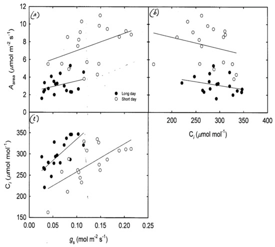 One of the most remarkable patterns revealed in our results was that short-day onions exhibited a lower internal leaf CO2 concentration per given leaf stomatal conductance, even though these plants showed a larger range of stomatal conductance and similar slope ranges (Figure 3c). This lower internal leaf CO2 concentration may be attributed to the faster CO2 assimilation of the plants grown in the short-day chamber, caused by higher metabolic activities when exposed to short daylength and higher temperatures at the time of bulb settings. Elevated CO2 increases crop yields [16], primarily because of higher rates of net photosynthesis [17]. However, Long [18] stated that it is the increase in photorespiration that reduces the rate of net photosynthesis at warmer temperatures. Similarly, Denne and Smith [19] observed a decreased rate of CO2 uptake in Picea sitchensis under long-day compared to the short-day conditions. These rates may be controlled by temperature and photoperiod, which also affects rates of uptake and loss of carbon from cells. Hobson et al. [9] stated that the increased daily uptake rate is due to the longer time for photosynthesis and not to an increased rate of photosynthesis. These discrepancies could be due to the variation in the potential responses of plant species to varying daylength and temperature levels of a growing season. The wider range of leaf stomatal conductance for the short-day plants, relative to these grown in the long-day chamber, may mean that the higher leaf stomatal conductance does not necessarily result in a higher leaf photosynthesis. It may also mean that the daylength and temperature levels must be coupled with a higher leaf conductance to result in a higher photosynthetic capability of onion leaves.