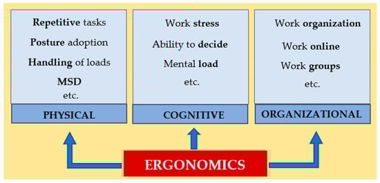 The International Ergonomics Association (IEA) defines ergonomics as ‘the scientific discipline concerned with the understanding of interactions among humans and other elements of a system, and the profession that applies theory, principles, data, and methods to design in order to optimize human well-being and overall system performance’. Ergonomics is classified into physical, cognitive, and organizational domains (Figure 2). Its objective is to improve and adapt the workplace/environment to people [6].