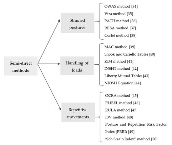 Several evaluation methods allow the ergonomic analysis of workers through observation and subsequent image analyses. These are called semi-direct methods [33]. Each of these methods are usually oriented to different MSD risk factors (Figure 3) [34,35,36,37,38,39,40,41,42,43,44,45,46,47,48,49,50].