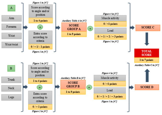 Figure 4. Calculation process in RULA (Rapid Upper Limb Assessment) method (adapted from [47,51]).