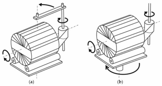 Today’s silage conservation in many regions of Europe [9,12], America [9], and China [1,11], especially for small and mid-sized producers, prefers round (i.e., cylindrical) bales wrapped individually. Since its origin in the 1980s, the conventional wrapping technique, according to which film strips are wrapped along the longitudinal axis of a bale, from the base to the top or vice versa, resulting in successive film layers, has been at the heart of the modern bale silage technique. Two main types of such round-bale wrappers are available [13,14]. In the first type, the film is applied by a pre-stretching unit mounted on an arm rotating around the bale (Figure 1a); see also [15]. The second type uses a rotating table on which the bale is rotated around its longitudinal axis, as seen in Figure 1b. For effective winding, the tension of the film has to be appropriately set [5]. Distribution of the film strips wrapped around the bale is illustrated in Figure 1, and is the same for the two types of round-bale wrappers; see also the bale wrapper documentation [16].