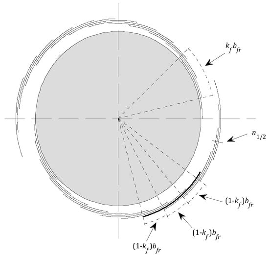 where is the width of un-stretched film and Poisson’s ratio and unit deformation describe the mechanical properties of the film. The main symbols are summarized, mostly with the references to respective equations, where they are defined or used for the first time, in Appendix B.1. The above assumption means that all film strips were equally overlapped by successive strips; the cross-section of the bale with overlapping film strips of width and exemplary overlap are presented in Figure 2. For the selected film strip (marked with a bold line) and two subsequent strips, the parts of the stretched film strips that were non-overlapped by the next film strip, are also indicated in Figure 2.