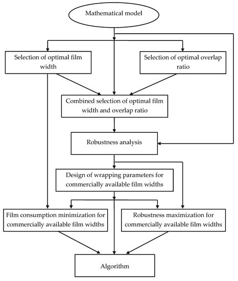 The problems of the choice of the best commercially available film width to guarantee minimal film consumption or maximal tolerance on uncertainty of the overlap were stated and solved. It was found that these requirements were not congruent. Consequently, design requires a careful trade-off between satisfactory robustness and the small consumption of the film. Simple mathematical formulas were derived to compute the optimal overlap ratio and to select the best film width, on the basis of which a new algorithm for wrapping parameters design was developed, executed, and numerically verified. For the wrapping parameters determined according to the algorithm, only near-optimal film usage was achieved, from which the analytical and numerical analyses of the relative errors for such approximations of the minimal film consumption were carried out.