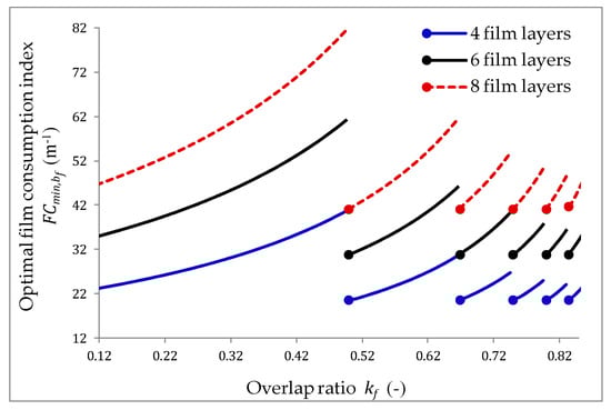 On the other hand, the results of Proposition 2 state that for any film width being fixed, every satisfying Equation (4), is an optimal overlap ratio, and the optimal film usage is given by Equation (21). This function is minimal if and only if the film width is such that: