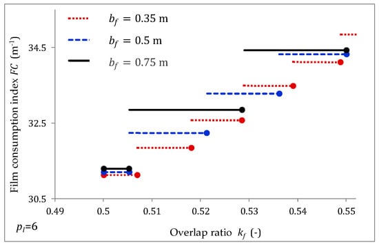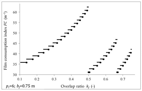 | film consumption optimal with respect to film width and overlap ratio, Equation (23), m−1 | |