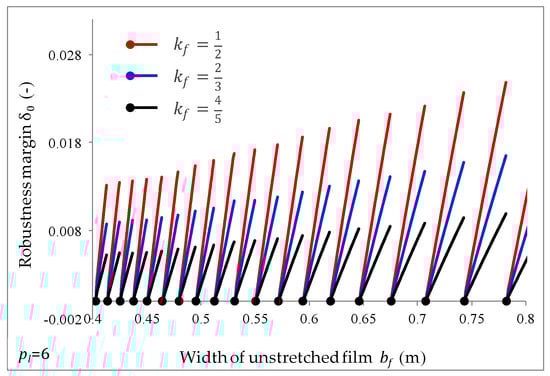 The main concern in this example is determination of the complete sets of optimal film widths for a few exemplary overlap ratios. The bale silage of diameter m [5,30] is considered. Conventional wrappers are adjusted to wrap cylindrical bales up to 1.6 m diameter and up to 1.2 m height [16,29]; or are capable of wrapping round bales up to 1.2 m height and 1.5 m diameter [29]. However, typical bales are 1.2–1.25 m in diameter and height [12,14]. The Poisson’s ratio and unit deformation of the stretch film are assumed to be the same for all examples and figures, which characterize, among others, commercial polyethylene (PE) film used traditionally because of its mechanical characteristics and low costs. Assume . The function is illustrated in Figure 4 for in the range m for the exemplary overlap ratios .