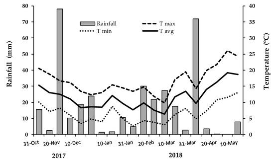 Temperature trend (max = maximum; min = minimum; avg = average) and rainfall during the growing cycle.
