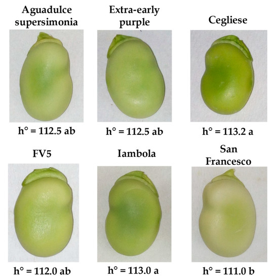Seed h° (hue angle) value of six genotypes of fava bean as a vegetable for fresh consumption. Different letters indicate statistically significant differences at P = 0.05.