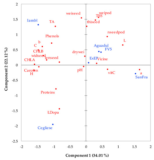 For a visual analysis of the data, principal component analysis (PCA) (PRINCOMP procedure, SAS software, Cary, NC, USA) was performed on mean centered and standardized (unit variance scaled) data prior to analysis. The data matrix submitted to PCA was made up of six observations (six genotypes—Aguadulce supersimonia, extra-early purple, Cegliese, San Francesco, Iambola, and FV5) and 23 variables (L, a*, b*, h°, C, dry weight, seed weight, pod weight, seed length, seed width, seed thickness, number of seeds per pod, pH, total phenols, crude protein, vitamin C, total carotenoids, chlorophyll a and b, vicine, L-dopa, titratable acidity, and total soluble solids). PCA was applied in order to obtain an interpretable overview of the data set variability. The results of the PCA are shown as biplot (XLStat, Addinsoft, Paris, France).