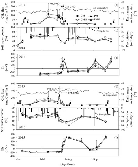 The CH4 flux in the fallow season was lower than 0.2 mg C m−2 hr−1 (Figure S1). In the growing season, CH4 flux increased, especially in the early part of the season, in all treatments (Figure 1a,d). After mid-season drainage, CH4 flux was low towards the end of the growing season. In the first year, CH4 flux decreased and Eh increased faster in PM and PMG than in CM and CMG (Figure 1a,c). In the second year, CH4 flux in all treatment increased just after the starting MD (Figure 1d,f). The variation between treatments in soil water content was greater in the early growing season, decreased during mid-season drainage, and increased after that (Figure 1e,a).
