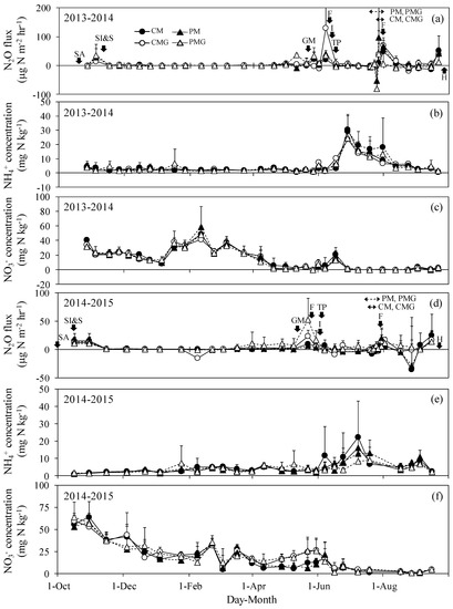 Seasonal variations in N2O flux (a,d), ammonium (NH4+) concentration (b,e), and nitrate (NO3−) concentration (c,f). Error bars represent standard deviations. SA, SI, and S represent straw application, incorporation, and seeding, respectively. GM, I, F, TP, and H represent green manure and weeds incorporations, irrigation, fertilization, transplanting, and harvest, respectively. Arrows of the continuous and dotted lines show the periods of mid-season drainage.