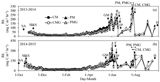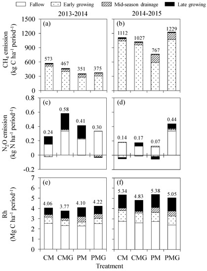Seasonal Rh variations are shown in Figure 3a,b. In the fallow season, Rh in all treatments decreased from autumn to winter and increased towards spring. There were significant correlations between Rh and soil temperature in the fallow season in all treatments in both years, except for two plots in treatments CMG and PMG in the first and second years, respectively (Table S1). Rh increased in the early growing season and during mid-season drainage in both years (Figure 3). After mid-season drainage, Rh decreased in the late growing season in all treatments in the first year, whereas it decreased only in CM and CMG in the second year.