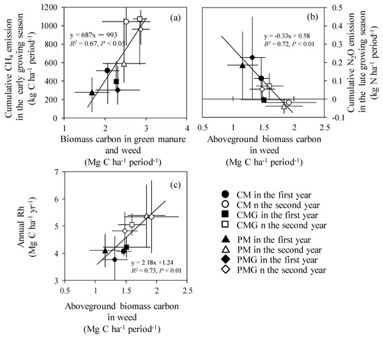 Linear positive correlations between N2O flux and Rh in the fallow season were observed in CM (y = 0.08x − 1.61, R2 = 0.46, P < 0.05), PM (y = 0.13x − 3.61, R2 = 0.49, P < 0.01), and PGM (y = 0.14x − 2.80, R2 = 0.72, P < 0.01) in the first year (Figure 5a) and in CM (y = 0.06x − 1.17, R2 = 0.62, P < 0.01), CMG (y = 0.09x − 2.20, R2 = 0.70, P < 0.001), PM (y = 0.05x − 0.88, R2 = 0.48, P < 0.001), and PMG (y = 0.12x − 1.60, R2 = 0.84, P < 0.001) in the second year (Figure 5b). There were strong relationships between GHG and applied carbon (with the highest correlation coefficients, Figure 6). Cumulative CH4 emission in the early growing season was positively correlated with applied biomass carbon in green manure and weeds (Figure 6a). Cumulative N2O emission in the late growing season was negatively correlated, and annual Rh was positively correlated with applied aboveground biomass carbon from weeds (Figure 6b,c). NGHGE increased significantly with increasing applied biomass carbon from green manure and weeds (y = 37.6x − 54.1, R2 = 0.64, P < 0.05, data is not shown). There were no significant relationships between N2O emission and applied nitrogen (Table S9). Other correlation coefficients for the relationships between GHG emissions and inputs of carbon (from green manure, weeds, and roots) and nitrogen (from green manure, weeds, roots, and fertilized nitrogen) are given in Tables S8 and S9.