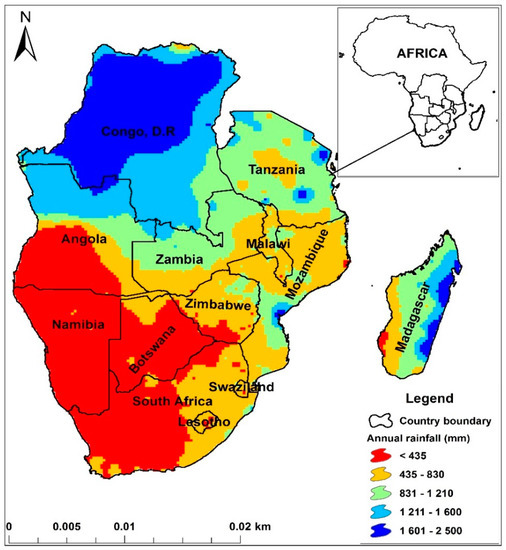 The SADC is an economic grouping of 16 countries: Angola, Botswana, Comoros, Democratic Republic of Congo, Lesotho, Madagascar, Malawi, Mauritius, Mozambique, Namibia, Seychelles, South Africa, Swaziland, Tanzania, Zambia and Zimbabwe (Figure 1). Of the total area of the region, which is 986,246,000 ha, only 6.11% is cultivated. The worsening water scarcity challenges are evidenced by the huge percentage of the regional area, which is arid (75%), meaning that only twenty-five percent is humid. The highly variable and unevenly distributed rainfall oscillates between 100 and 2000 mm/year [19]. Figure 1 is a locational map of the SADC region in Africa, also showing the unevenness in the distribution of annual rainfall.