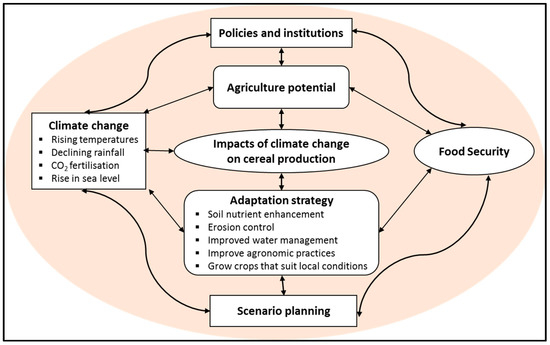 Observed rainfall data for a period of 47 years (1960–2007) obtained from 908 weather stations spread in the region was used to assess rainfall trends and aridity levels. Crop yield data for the same period was obtained from the Regional Strategic Analysis and Knowledge Support System (ReSAKSS) (www.resakss.org). Figure 2 shows the methodological flowchart followed in this review. The model depicts the linkages between policies and institutions, scenario planning and food security under climate change. Institutions and polices are framed around scenario planning to determine adaptation strategies for food security [29]. Policies and institutions provide the political will to exploit the agricultural potential under climate change.