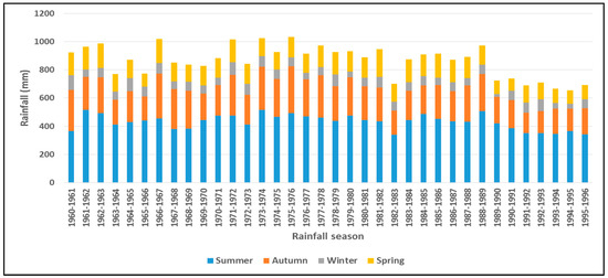 Figure 3 represents the variations in the annual average rainfall per season (summer, autumn, winter and spring) from 1960 to 1996 in southern Africa. In the SADC region, the summer season (December to February) is wet as it receives rainfall but the winter season (June to August) is dry as it receives insignificant rainfall [13]. Autumn (March to May) and spring (September to November) are transitional seasons ushering into winter and summer, respectively. Rainfall shows high variability from 1960–1961 to 1988–1989 (Figure 3) but as from 1989–1990 and thereafter, the variability is associated by a continuous decrease in rainfall totals during the summer periods, signifying a shortened rainy season. Drought recurrence explains the decreasing rainfall and this has been impacting on agricultural productivity as also suggested by previous studies [47,48,49].