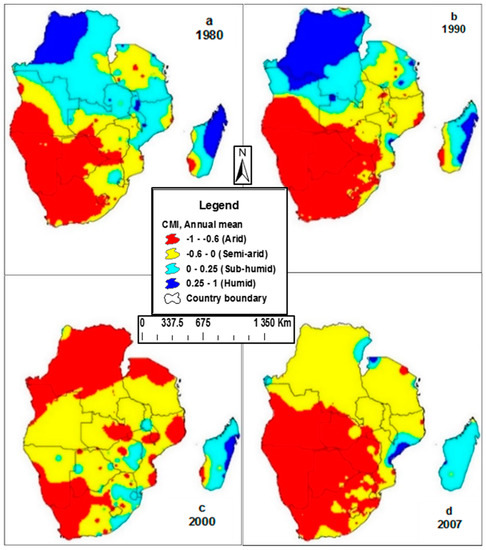 The increasing aridity of the SADC region is indicated in Figure 4, which shows changes in water scarcity from 1980 to 2007. The aridity or water scarcity over time was calculated through the climate moisture index (CMI) using Equations 1 and 2 [50]. When CMI values are negative or below 0, it indicates that potential evapotranspiration (PET) exceeds precipitation (P). According to Vörösmarty et al., there is a classification link between CMI values and climatic conditions (CMI < −0.6 = Arid; −0.6 < CMI <0 = Semi-arid; 0 > CMI < 0.25 = Sub-humid and CMI > 0.25 = Humid) [50]. The average CMI for the region was calculated at −0.80, qualifying the region to be arid and water scarce according to the scale provided by Vörösmarty [50]. The level of aridity in the region is also confirmed by previous studies that show an increasing level of aridity [51]. The increasing aridity is only worsening the vulnerability of the region that depends on agriculture. The CMI is effectively used in assessing aridity and water scarcity and is expressed as: