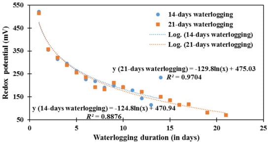 Changes in soil redox potential with duration of waterlogging. Regression equations are provided for the 14-day and 21-day waterlogging treatments.