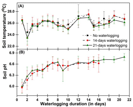 Changes in soil temperature (A) and soil pH (B) with waterlogging duration after waterlogging initiation. Vertical bars indicate standard deviation for each sampling date.